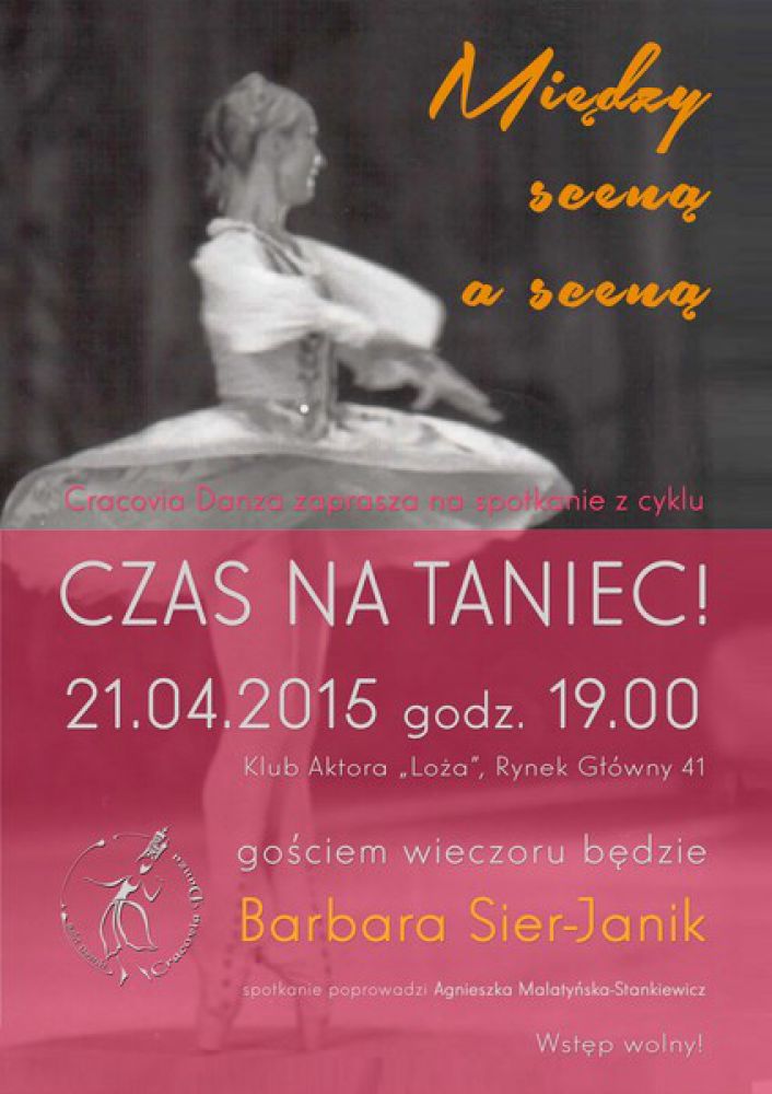 Barbara SIER-JANIK - tancerka i pedagog, przez wiele lat pierwsza solistka Baletu Teatru Wielkiego w Warszawie, wieloletnia nauczycielka tańca w warszawskiej Państwowej Szkole Baletowej, wykładowca tańca klasycznego i nowoczesnego w Akademii Muzycznej w Warszawie, a od 2007 roku wykładowca tańca klasycznego na Wydziale Teatru Tańca PWST w Krakowie, oddział w Bytomiu będzie gociem kolejnego spotkania z przygotowywanego przez Balet Dworski Cracovia Danza cyklu CZAS NA TANIEC!. Spotkanie zatytułowane Między scenš a scenš odbędzie się we wtorek, 21 kwietnia, o godz. 19, w Klubie Aktora Loża. Kraków, Rynek Główny 41.