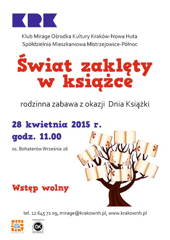 Z okazji Dnia Ksišżki Klub Mirage Oœrodka Kultury Kraków-Nowa Huta (os. Bohaterów Wrzeœnia 26) zaprasza dzieci od 2 do 5 roku życia wraz z rodzicami i dziadkami na szczególne spotkanie z ksišżkš. Na wszystkich, którzy w dniu 28 kwietnia przybędš na godz. 11.00 do Klubu czekać będš liczne atrakcje: bajkowe zagadki i quizy, historyjki obrazkowe, wykonywanie zakładek do ksišżek oraz tańce przy muzyce ze znanych i lubianych bajeczek. Przypomnimy sobie najsłynniejsze historie o Czerwonym Kapturku, Królewnie Œnieżce i Krasnoludkach, Jasiu i Małgosi, Calineczce oraz Pinokio. W tym dniu chcemy zachęcać dzieci do oglšdania bajek i czytania ksišżek, by mogły przeżywać cudowne chwile ze swoimi ulubionymi bohaterami w magicznym œwiecie bajek i fantazji. Osoby zainteresowane udziałem prosimy o zgłoszenie udziału przed imprezš.