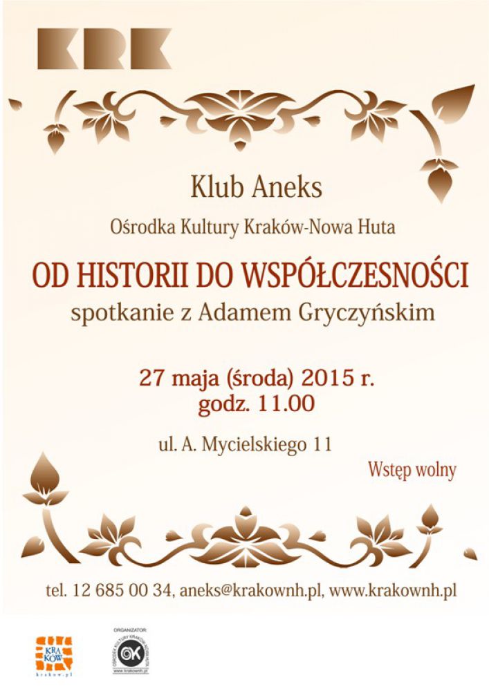 Klub Aneks Oœrodka Kultury Kraków-Nowa Huta (ul. A. Mycielskiego 11) zaprasza mieszkańców Łuczanowic i okolic na spotkanie z panem Adamem Gryczyńskim, które odbędzie się 27 maja o godz. 11.00. Ten znany krakowski fotograf przybliży historię i współczesnoœć Nowej Huty prezentowanš na zdjęciach. Adam Gryczyński jest autorem między innymi albumu Czas zatrzymany. Fotografie z lat 1883-1963 z terenów Nowej Huty i okolic, który w 2006 r. otrzymał nagrodę Krakowska Ksišżka Miesišca. Swoje prace prezentował na kilkudziesięciu wystawach w kraju i za granicš (m.in. w USA, Brazylii, Rosji we Włoszech oraz na Litwie i Węgrzech).