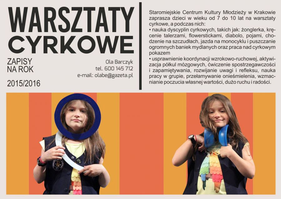 Szukasz czego, co wyładuje nadmiar Twojej energii i będzie doskonałš zabawš? Jeżeli tak, to mamy co dla Ciebie! Warsztaty cyrkowe, czyli nauka i zabawa w jednym! Poznasz różnorodne dyscypliny cyrkowe, żonglerkę, jazdę na monocyklu, chodzenie na szczudłach, a przy okazji poprawisz swoje zdolnoci koncentracji, spostrzegawczoci i zapamiętywania. Czekamy na Ciebie!