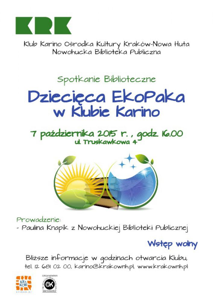 EkoPaka to program edukacyjny dla małych i dużych realizowany przez Klub Karino Orodka Kultury Kraków-Nowa Huta (os. Chałupki, ul. Truskawkowa 4). Pod hasłem EkoPaka Zamykamy Obieg, pokazujemy zamknięty obieg surowców, aby dzieci rozumiały, że to, co zostaje z produktów opakowania, zużyte elementy to nie mieci, ale materiał, z którego można stworzyć co nowego. W ramach współpracy Klubu Karino z Nowohuckš Bibliotekš Publicznš organizowane jest spotkanie ekologiczne dla dzieci, które będš mogły uczestniczyć w ciekawym, edukacyjnym ogólnopolskim programie. Zajęcia poprowadzi Pani Paulina Knapik z Nowohuckiej Biblioteki Publicznej.