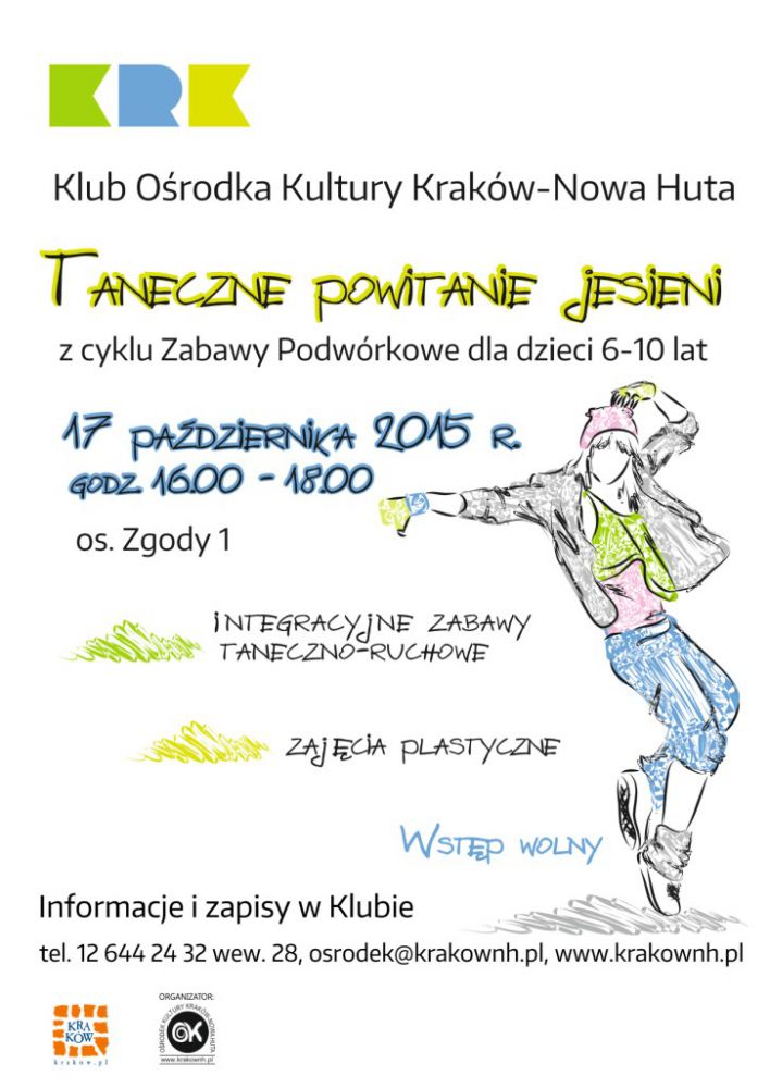 Celem kolejnego spotkania z cyklu Zabawy podwórkowe organizowanego przez Klub Oœrodka Kultury Kraków-Nowa Huta (os. Zgody 1) jest kształtowanie wrażliwoœci estetycznej, poczucia piękna przyrody wœród najmłodszych oraz zaangażowanie dzieci do udziału w konkursach, zabawach integracyjnych i zajęciach plastycznych, których tematem będzie Pani Jesień oraz pejzaże jesienne. W przypadku ładnej pogody będziemy malować pejzaże jesienne kredš na asfalcie przed Klubem. Na imprezę 17 paŸdziernika w godz. 16-18 zapraszamy rodziny z dziećmi w wieku od 6 do 10 lat do wspólnego miłego spędzenia wolnego czasu w sobotnie popołudnie.