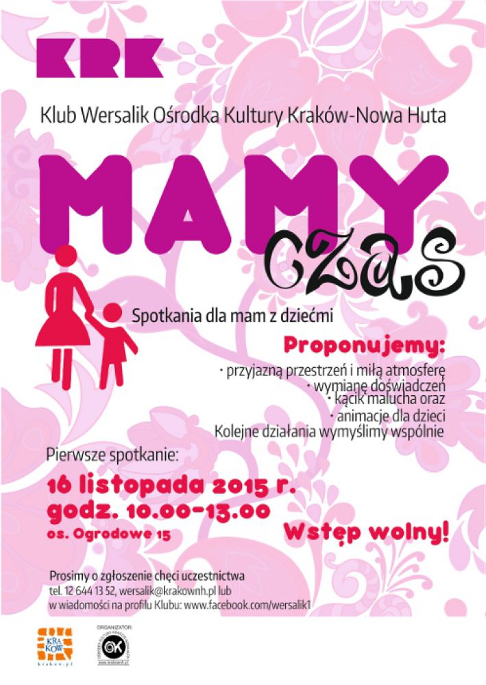 Zapraszamy na pierwsze spotkanie dla mam z dziećmi w Klubie Wersalik Orodka Kultury Kraków-Nowa Huta (os. Ogrodowe 15) w poniedziałek 16 listopada w godz. 10.00-13.00. MAMY czas to propozycja wspólnego spędzania czasu w miłej, nieformalnej atmosferze. Zapewniamy przyjaznš przestrzeń, kšcik dla Waszych maluszków, a także zabawy z animatorem. Nie zabraknie czasu na wspólnš wymianę dowiadczeń przy herbacie lub kawie. Nad kolejnymi działaniami pomylimy wspólnie i razem je zaplanujemy. Prosimy o zgłoszenie chęci wzięcia udziału (tel. 12 644 13 52, wersalik@krakownh.pl). Ze względów organizacyjnych iloć miejsc jest ograniczona.