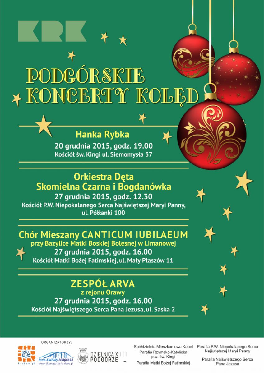 Organizatorzy: Dom Kultury "Podgórze", Rada Dzielnicy XIII, Spółdzielnia Mieszkaniowa Kabel Parafia Rzymsko- Katolicka p.w. w. . Kingi