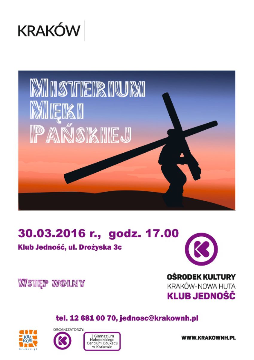 Zapraszamy do Klubu Jednoœć Oœrodka Kultury Kraków-Nowa Huta (ul. Drożyska 3c) na Misterium Męki Pańskiej - widowisko religijne wprowadzajšce w bogaty w wydarzenia i duchowe doœwiadczenia czas Wielkiego Tygodnia, które odbędzie się 30 marca o godz. 17:00. Widowisko przygotowane zostało wspólnie z uczniami I Gimnazjum Małopolskiego Centrum Edukacji. Inscenizacja oparta na Biblii, odtwarza wydarzenia męki i œmierci Jezusa.
