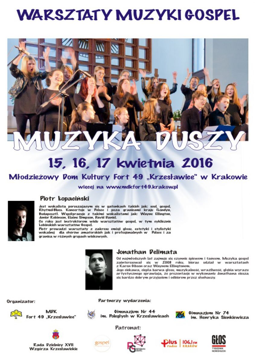 W dniach od 15 do 17 kwietnia 2016 roku, Młodzieżowy Dom Kultury Fort 49 „Krzesławice” w Krakowie os. Na Stoku 27b, serdecznie zaprasza na muzyczne i duchowe wydarzenie. Dnia 15 kwietnia w godzinach popołudniowych, rozpocznš się na terenie MDK Warsztaty Muzyki Gospel. Uwieńczeniem 3-dniowych warsztatów będzie koncert finałowy, który odbędzie się 17 kwietnia w Koœciele Miłosierdzia Bożego, os. Na Stoku 1A.