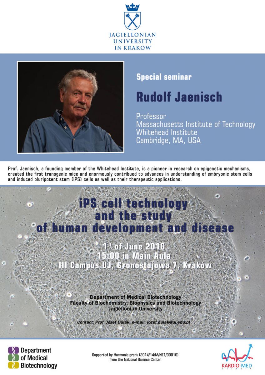 1 czerwca 2016 r. o godz. 15:00 w auli Kompleksu Dydaktyczno-Bibliotecznego przy ul. Gronostajowej 7 w Krakowie, odbędzie się wykład prof. Rudolfa Jaenischa pt. „iPS cell technology and the study of human development and disease". Prof. Jaenisch, członek-założyciel Whitehead Institute (Cambridge, USA), członek Amerykańskiej Akademii Nauk, laureat licznych prestiżowych nagród naukowych, jest pionierem w badaniach nad mechanizmami epigenetycznymi. Jako pierwszy uzyskał transgeniczne myszy, w olbrzymim stopniu przyczynił się do postępu w badaniach nad zarodkowymi komórkami macierzystymi oraz indukowanymi pluripotencjalnymi komórkami macierzystymi (iPS; induced pluripotent stem cells), wskazujšc zarazem na ich przyszłe zastosowanie terapeutyczne.
