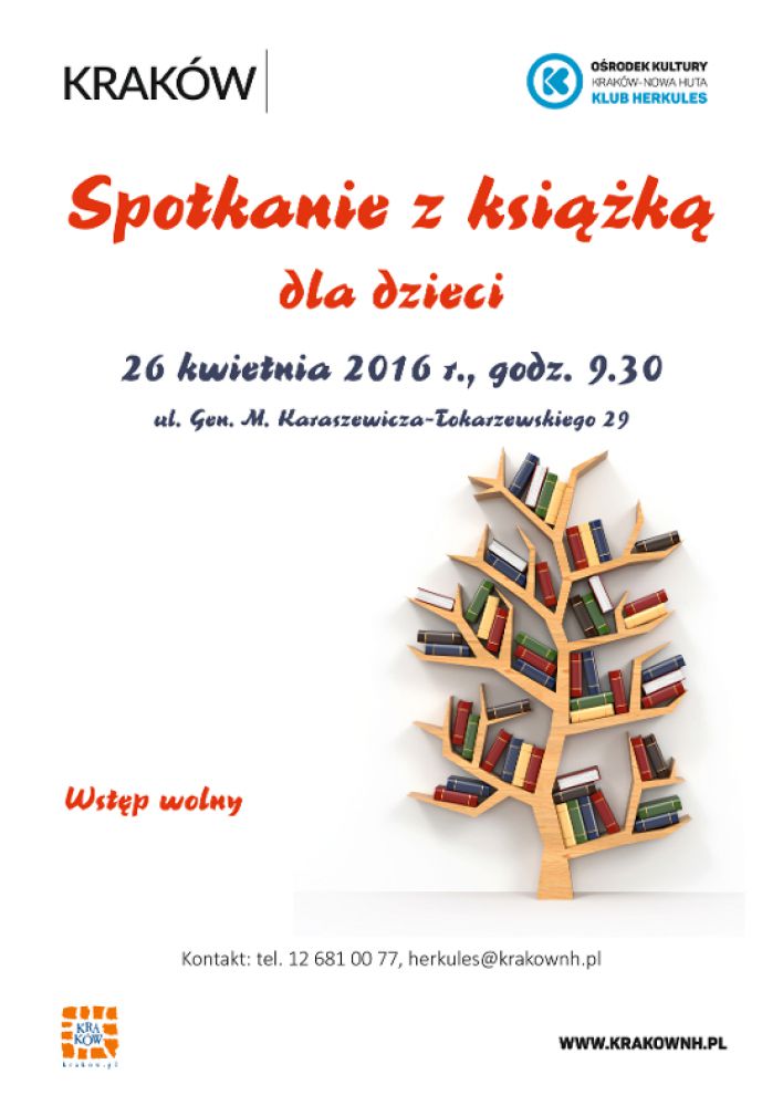 Klub Herkules Orodka Kultury Krakw-Nowa Huta (ul. Gen. M. Karaszewicza-Tokarzewskiego 29) zaprasza 26 kwietnia na godz. 9.30 na Spotkania z ksik. Zajcia literacko-edukacyjne poczone z zabaw, to cykl spotka, ktrego gwnym celem jest rozbudzenie kultury czytelniczej przez przyblianie uczniom rnych rodzajw ksiek dla dzieci. Dzieci maj okazj wysucha ciekawych bani, bajek i opowiada a wraz z ich bohaterami poznawa otaczajcy ich wiat. Kade spotkanie powicone jest innemu tematowi. Impreza organizowana jest wsplnie z Nowohuck Bibliotek Publiczn z okazji wiatowego Dnia Ksiki.