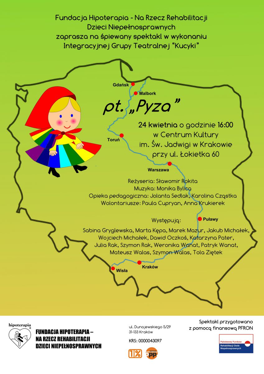 Integracyjna Grupa Teatralna "Kucyki" działajšca w ramach Fundacji Hipoterapia - Na Rzecz Rehabilitacji Dzieci Niepełnosprawnych ma zaszczyt zaprosić Państwa na swój najnowszy spektakl "Pyza". Przedstawienie odbędzie się w niedzielę 24 kwietnia, o godzinie 16:00 w Centrum Kultury im. w. Jadwigi w Krakowie, przy ul. Łokietka 60.
