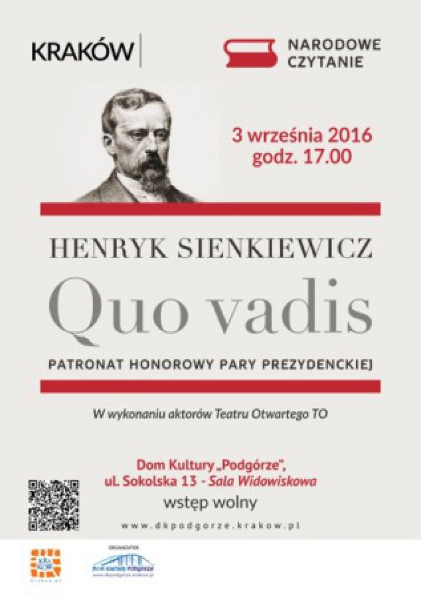 Rok 2016 ogłoszony został rokiem Henryka Sienkiewicza.3 wrzenia o godzinie 17.00 w Domu Kultury "Podgórze" odbędzie się Narodowe Czytanie "Quo vadis".