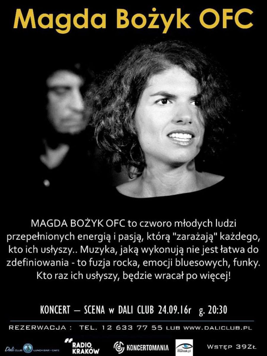 MAGDA BOŻYK OFC to czworo młodych ludzi przepełnionych energiš i pasjš, którš "zarażajš" każdego, kto ich usłyszy. Mieszajš style muzyczne w poszukiwaniu swojego własnego brzmienia. Muzyka, jakš wykonujš nie jest łatwa do zdefiniowania - to fuzja rocka, emocji bluesowych, funky. Nie bojš się Eksperymentowania i zmiany aranżacji, dlatego też grajš elektrycznie lub akustycznie, często z towarzyszeniem sekcji dętej. Kto raz ich usłyszy, będzie wracał po więcej!