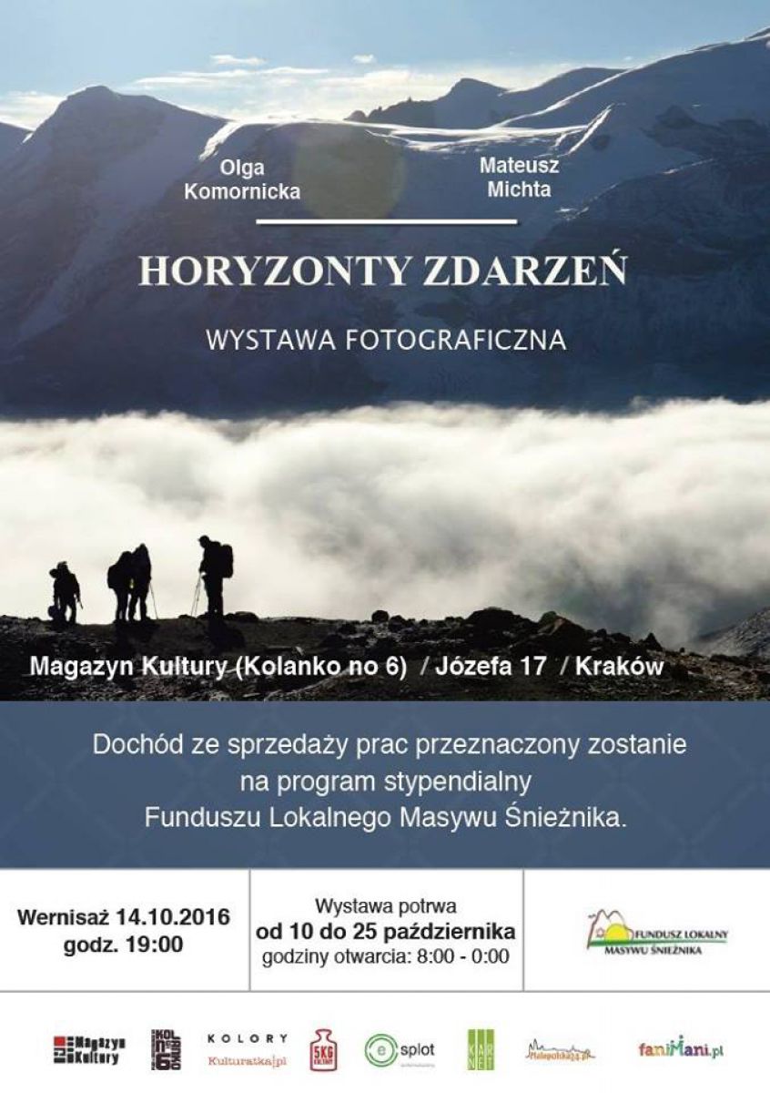 Już 10 paŸdziernika, w krakowskiej Fundacji Magazyn Kultury, rusza wystawa fotografii podróżniczej „Horyzonty zdarzeń”, autorstwa Olgi Komornickiej i Mateusza Michty. Wystawa potrwa do 25 paŸdziernika. W czasie jej trwania prócz podziwiania pięknych zdjęć przedstawiajšcych: Patagonię, Wietnam, Nepal, Islandię, Gruzję i Hiszpanię, będzie można również nabyć wybranš pracę. Dochód ze sprzedaży dzieł zostanie przekazany na program stypendialny „Z ršczki do ršczki” dla utalentowanych dzieci z niezamożnych rodzin, realizowany przez Fundusz Lokalny Masywu Œnieżnika. Fundusz można również wspierać przez serwis FaniMani.pl