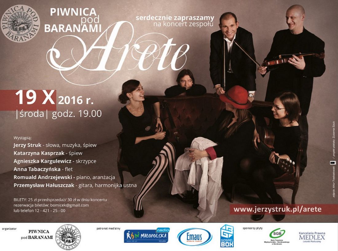 Serdecznie zapraszamy do pięknego Krakowa na koncert zespołu Arete w PIWNICY POD BARANAMI 19 paŸdziernika (œroda), 2016r. godz. 19.00