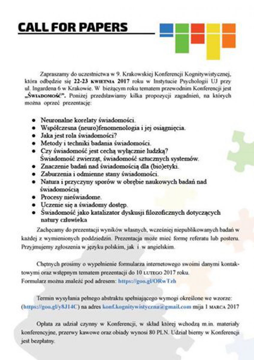 Krakowska Konferencja Kognitywistyczna to wydarzenie organizowane przez członków Koła Naukowego Studentów Kognitywistyki UJ majšce na celu promocję tej interdyscyplinarnej dziedziny. W roku 2017 tematem przewodnim 9 edycji konferencji będzie wiadomoć.