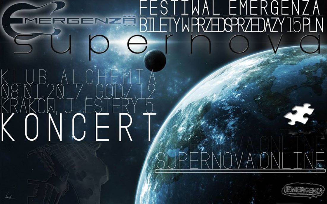 Wszystkich, którzy chcš zobaczyć Supernovš na żywo, a nie mogš pojawić się na sobotnim koncercie zapraszamy w najbliższš niedzielę do Alchemii na 3 dzień międzynarodowego Festiwalu Emergenza - największego na œwiecie konkursu tego typu! Zaplanowane sš występy oœmiu kapel. W tym Supernovej! Bilety będš dostępne również w przedsprzedaży (15PLN) na sobotnim koncercie Supernovej w klubie Buda! Zapraszamy!