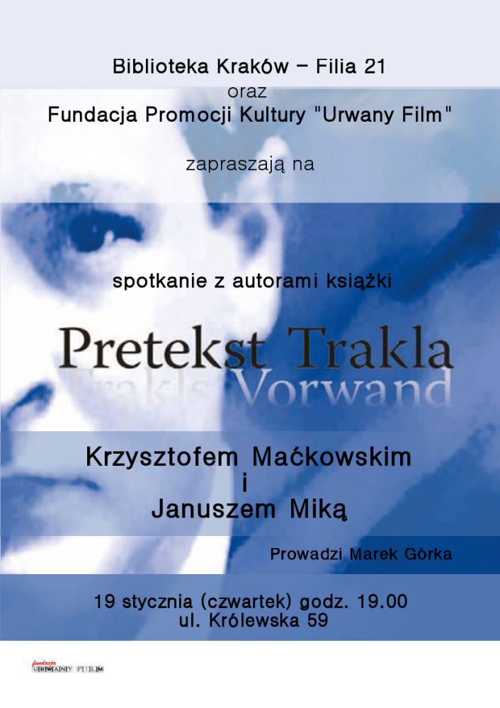 Biblioteka Kraków filia 21 i Fundacja Promocji Kultury Urwany Film zapraszaj¹ na spotkanie z autorami ksi¹æki Pretekst Trakla. Trakls Vorwand Krzysztofem Maękowskim i Januszem Mik¹.