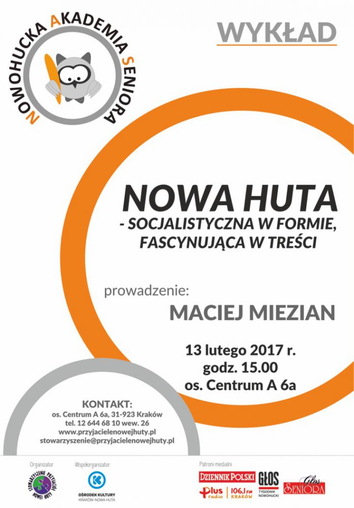 Nowohucka Akademia Seniora (os. Centrum A 6a) zaprasza 13 lutego na wykład pt. Nowa Huta socjalistyczna w formie, fascynujšca w treci. Wykład powięcony Nowej Hucie, bardziej i mniej znane fakty zwišzane z historiš jej powstania przedstawi słuchaczom Nowohuckiej Akademii Seniora, Maciej Miezian, pracownik Muzeum Historycznego Miasta Krakowa Oddział Dzieje Nowej Huty. Seniorzy będš mieli możliwoć posłuchać o gospodarczym i propagandowym charakterze zadania, jakim była budowa Nowej Huty, o jej mieszkańcach, wizytach zagranicznych goci, zwiedzaniu Huty, jako obowišzkowym punkcie pobytu w Krakowie oficjalnych delegacji czy wycieczek turystycznych, historii Huty i kombinatu po 1989 r., założeniach architektonicznych. Organizatorami Nowohuckiej Akademii Seniora sš Stowarzyszenie Przyjaciół Nowej Huty oraz Orodek Kultury Kraków-Nowa Huta.