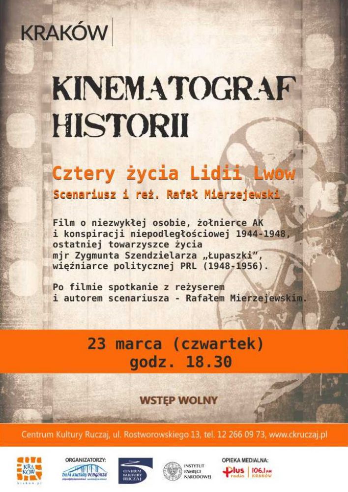 Projekcja filmu o niezwykłej osobie, żołnierce AK i konspiracji niepodległociowej 1944-1948, ostatniej towarzyszce życia mjr Zygmunta Szendzielarza Łupaszki oraz spotkanie z reżyserem i autorem scenariusza Rafałem Mierzejewskim.