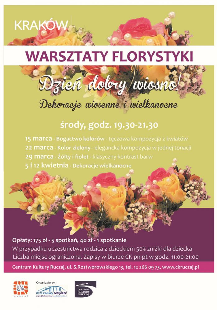 Informacje i zapisy w biurze Centrum Kultury Ruczaj od poniedziałku do pištku w godz. 11:00-21:00, soboty 9:30-14:00; tel. 12 266 09 73, biuro@ckruczaj.pl.
