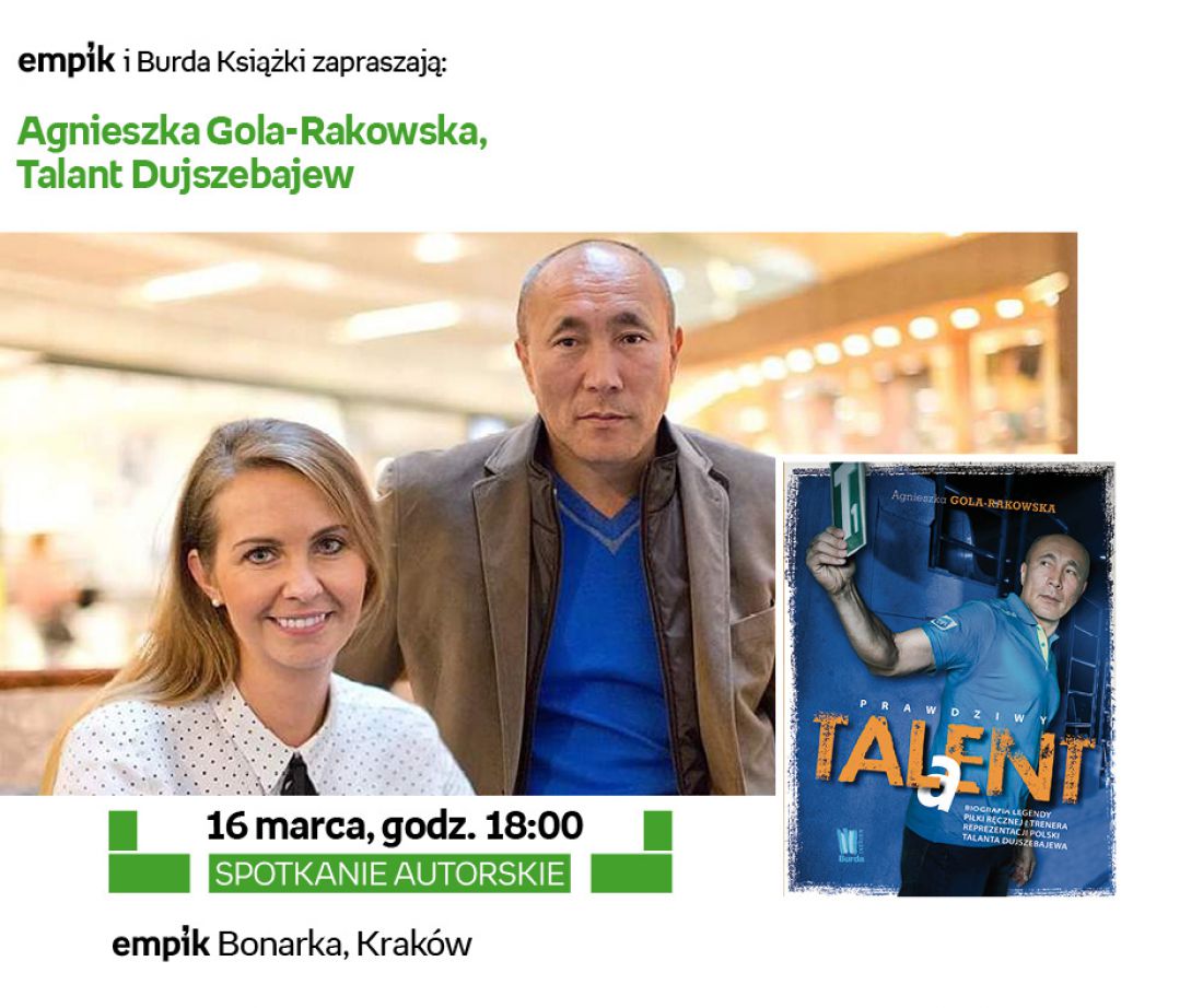 „Prawdziwy talent. Biografia legendy piłki ręcznej i trenera Reprezentacji Polski Talanta Dujszebajewa” (Burda Ksišżki) to najnowsza ksišżka dziennikarki, reżyserki i scenarzystki Agnieszki Goli-Rakowskiej. Podczas spotkania goœciem specjalnym będzie sam bohater – Talant Dujszebajew, człowiek o dwóch twarzach; jednš pokazuje na boisku, drugš odkrywa poza nim.