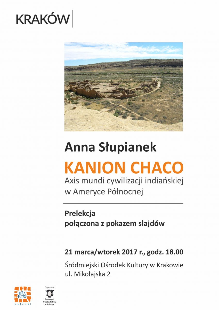 Kanion Chaco jest to malowniczy kanon położony w północno - zachodniej częci obecnego stanu Nowy Meksyk. Znajduje się on na obszarze wieloletniego rozwoju jednej z ważniejszych kultur indiańskich zamieszkujšcych tereny Południowego Zachodu USA - a mianowicie rolniczej kultury Pueblo. W trakcie spotkania przybliżona zostanie charakterystyka kultury Pueblo, rola jakš odgrywało osadnictwo w Kanionie Chaco oraz przedstawiony zostanie obraz współczesnych Indian Pueblo.