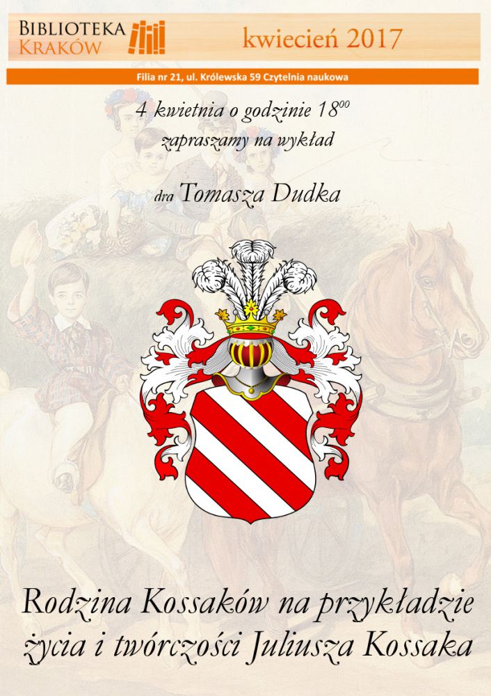 Zapraszamy na wykad doktora Tomasza Dudka o artystycznej rodzinie Kossakw na przykadzie ycia i twrczoci polskiego malarza, rysownika i ilustratora Juliusza Kossaka.