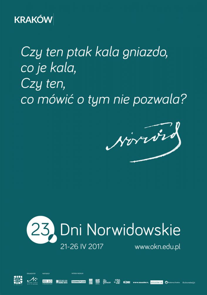 W dniach 21-26 kwietnia 2017 r. w Krakowie odbędš się 23. Dni Norwidowskie organizowane przez Oœrodek Kultury im. C. K. Norwida we współpracy z XII Liceum Ogólnokształcšcych im. C. K. Norwida. Festiwal ma na celu przybliżenie twórczoœci tego wybitnego, wszechstronnego i ponadczasowego artysty - poety, prozaika, dramatopisarza, rzeŸbiarza, malarza i rysownika. W przestrzeni miasta pojawiš się plakaty z cytatami norwidowskimi, odsyłajšce do znaczeń ważnych także dziœ.