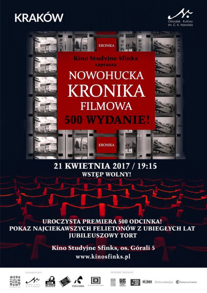 Nowohucka Kronika Filmowa to prawdopodobnie jedyna taka kronika w Polsce. Powstała w 2004r., jej pomysłodawcami byli filmowcy, artyci, animatorzy kultury i dziennikarze zwišzani z Nowš Hutš, a producentem od poczštku Orodek Kultury im. C. K. Norwida. Pomysł tworzenia Nowohuckiej Kroniki Filmowej nawišzuje do wywietlanej przez lata w kinach Polskiej Kroniki Filmowej, która dzi jest kopalniš wiedzy o poprzednich dekadach. Jak ona pokazuje rzeczy ważne, charakterystyczne, interesujšce ale dotyczšce tylko jednej, za to największej dzielnicy Krakowa. I można jš oglšdać przed wszystkimi seansami w ostatnim nowohuckim kinie Kinie Studyjnym Sfinks. Od prawie 13 lat kamera Kroniki towarzyszy ciekawym wystawom, koncertom, imprezom filmowym i teatralnym, pokazuje wydarzenia wielkie i znaczšce, ale także te małe, realizowane przez pasjonatów. Widzowie znajdujš tu portrety ludzi, opowieci o ciekawych miejscach i historii, a także wiele materiałów archiwalnych. Nowohucka Kronika Filmowa dotarła włanie do 500 odcinka! Będzie to wydanie specjalne po raz pierwszy zrealizowane przez wszystkie ekipy razem. Na jego uroczystš, jubileuszowš premierę Orodek Kultury im. Norwida i Kino Studyjne Sfinks zapraszajš 21 IV o godz. 19.15. W programie wieczoru znajdzie się również pokaz najciekawszych felietonów z ubiegłych lat, które zaprezentujš ich autorzy, oraz jubileuszowy tort!