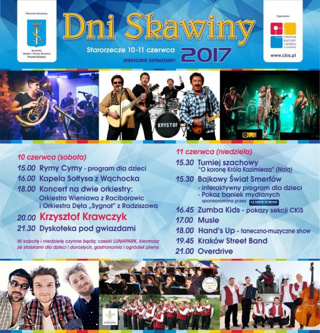 10 i 11 czerwca zapraszamy na Starorzecze Skawinki w Parku Miejskim na huczne obchody więta Naszego Miasta. W tegorocznym programie każdy znajdzie co dla siebie. Będzie wspólna biesiada, program dla dzieci, występ orkiestr dętych, disco polowego zespołu Musle i rockowego Overdrive, a także koncert Krzysztofa Krawczyka.