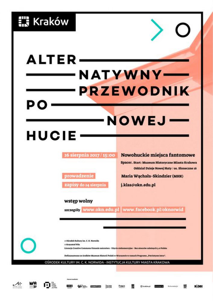 ALTERNATYWNY PRZEWODNIK PO NOWEJ HUCIE - działania edukacyjno-animacyjne z zakresu dziejów lokalnych w postaci spacerów szlakami dziedzictwa kulturowego, prelekcji o nieoczywistych historiach dotyczšcych terenów Nowej Huty oraz prezentacji miejsc, które odwołujš się do lokalnej tożsamoci. Projekt zakończy wydanie tworzonej kolektywnie publikacji w formie alternatywnego przewodnika po przestrzeni i dziejach Nowej Huty w formie drukowanej i elektronicznej. Dofinansowano ze rodków Muzeum Historii Polski w Warszawie w ramach Programu Patriotyzm Jutra.