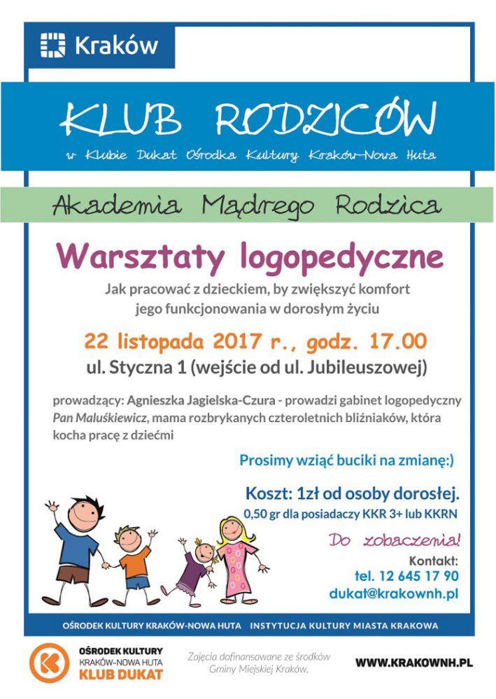 Klub Dukat Oœrodka Kultury Kraków-Nowa Huta (ul. Styczna 1) zaprasza na Warsztaty logopedyczne w Klubie Rodziców w œrodę 22 listopada w godz. 17.00-18.30. Spotkanie ze specjalistš w dziedzinie logopedii w ramach Klubu Rodziców. Zajęcia poprowadzi Pani Agnieszka Jagielska-Czura, mama rozbrykanych czteroletnich bliŸniaków, która kocha pracę z dziećmi. Sama prowadzi gabinet logopedyczny Pan Maluœkiewicz, w którym pokazuje rodzicom jak pracować z dzieckiem, by zwiększyć komfort jego funkcjonowania w dorosłym życiu.