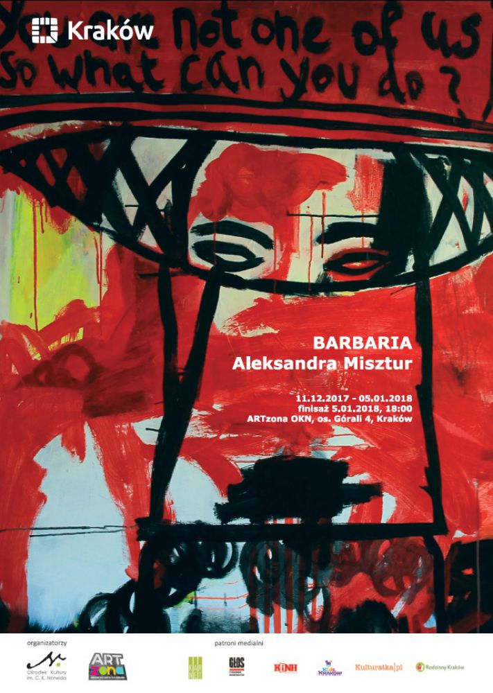 Cykl BARBARIA składa się z obrazów wykonanych akrylami na płótnie i na papierze. Forma cyklu cechuje się uwypuklonym, szorstkim i skrajnie emocjonalnym sposobem kreacji. Poprzez intuicyjne i dynamiczne struktury penetruję do podwiadomoci bez dosłownego wyjanienia. Znaczenie jest umowne, a interpretacja pozostawiona widzom.