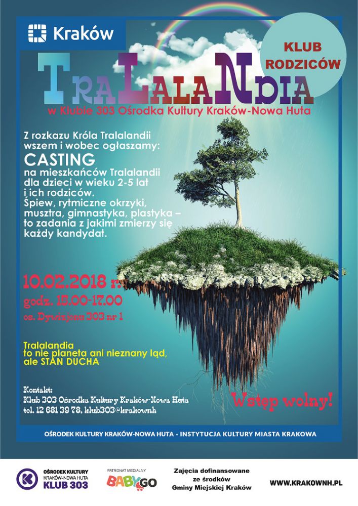 Z rozkazu Króla Tralalandii wszem i wobec ogłaszamy casting dla dzieci w wieku 2-5 lat i ich rodziców na mieszkańców Tralalandii. Zgodnie z telegramem nadanym przez Króla Tralalandii casting odbędzie się w Klubie 303 Orodka Kultury Kraków-Nowa Huta (os. Dywizjonu 303 nr 1) w sobotę 10 lutego w godz. 15.00-17.00. Jak wiadomo rdzenni Tralalończycy sš roztańczeni, rozpiewani, bardzo wysportowani, a ich podstawowym zajęciem jest rękodzieło artystyczne. piew, rytmiczne okrzyki, musztra, gimnastyka, plastyka to zadania, z jakimi zmierzy się każdy kandydat. Każdy maluch, każdy rodzic też może sprawdzić swoje siły w Tralalandiowym castingu i stać się mieszkańcem Tralalandii!
