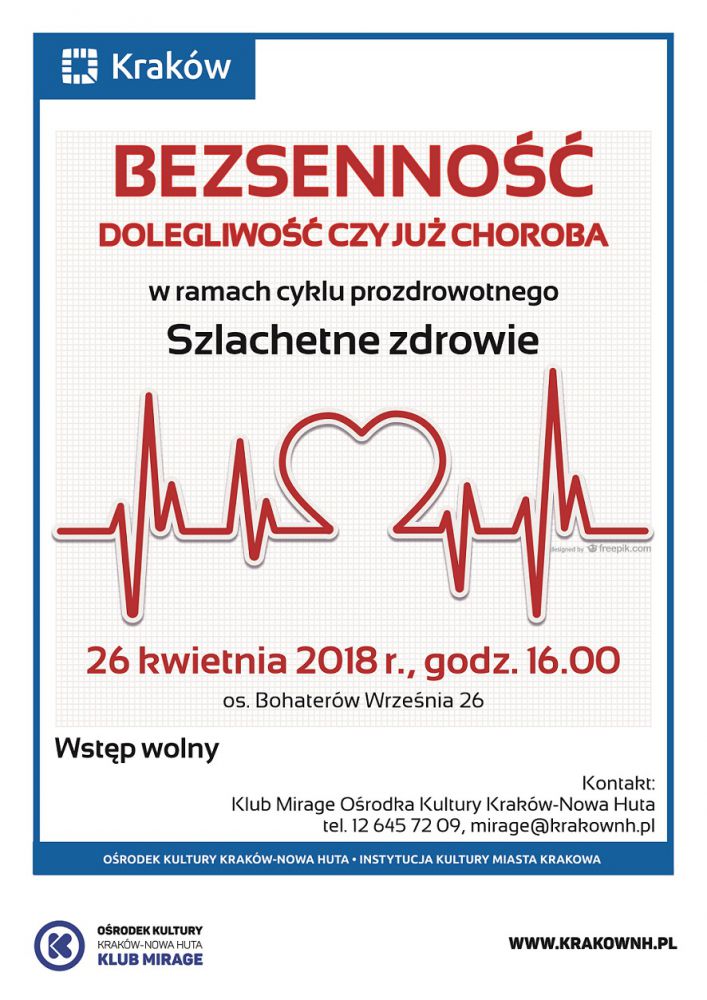 Klub Mirage Orodka Kultury Kraków-Nowa Huta (os. Bohaterów Wrzenia 26) zaprasza 26 kwietnia o godz. 16.00 na spotkanie powięcone będzie problemowi bezsennoci. Jest to jeden z najczęciej zgłaszanych problemów zdrowotnych. Uważa się, że dotyczy on rednio od 20-60% ludzi. Kto najczęciej choruje na bezsennoć? Dlaczego pojawiajš się problemy ze snem? Jak się leczy bezsennoć? Na te i inne pytania odpowie specjalista. Szlachetne zdrowie to cykl wykładów i warsztatów z zakresu edukacji prozdrowotnej. Serdecznie zapraszamy.