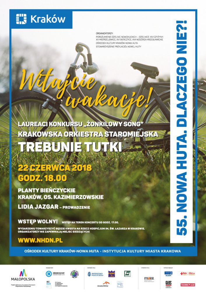 Tegoroczne wakacje rozpocznš się w Nowej Hucie mocnym muzycznym akcentem - koncertem plenerowym z cyklu Nowa Huta. Dlaczego Nie?!, w którym udział wezmš: laureaci Konkursu Piosenki Żonkilowy Song, Krakowska Orkiestra Staromiejska oraz zespół TREBUNIE TUTKI. Koncert odbędzie się na scenie plenerowej na Plantach Bieńczyckich (os. Kazimierzowskie) w dniu zakończenia roku szkolnego - 22 czerwca 2018 r. Poczštek o godz. 18.00.