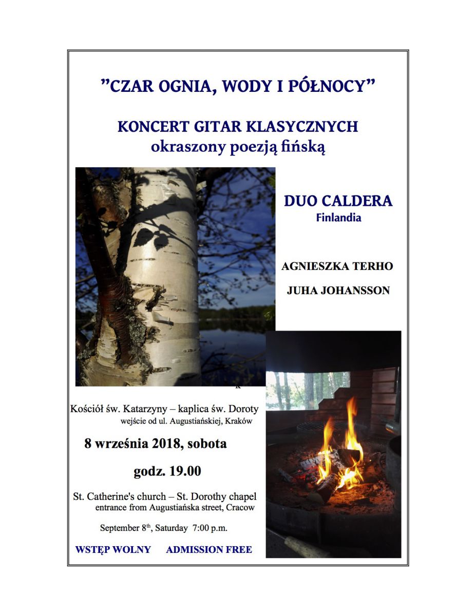 W programie koncertu fińsko-polskiego duetu znajdzie się między innymi aranżacja Valse Triste - kompozycji Jean'a Sibeliusa oraz polska premiera powstałej w 2017 roku na zamówienie duetu "Suite Caldera" której twórcš jest fiński kompozytor Harri Ahmas. Ogień i mistyka gitarowego brzmienia towarzyszyć będzie także muzyce brazylijskiej, hiszpańskiej, norweskiej i brytyjskiej spowijajšc całoœć koncertu różnorodnoœciš barw i emocji. Usłyszymy również słowa poezji fińskiej w oryginalnym języku oraz w przekładzie polskim.