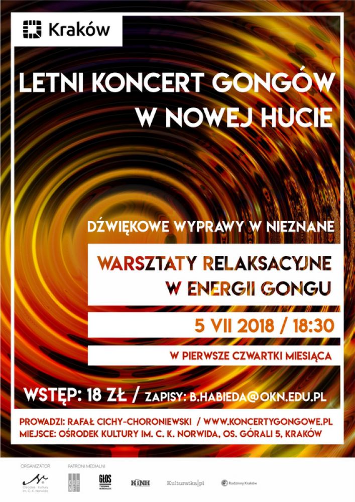 Relaks dla ciała i radoć dla duszy to w jednym zdaniu cel udziału w koncercie gongowym. Wrażenia dostarczane słuchaczom przez dwięki gongu sš jedyne w swoim rodzaju, niepowtarzalne i nieporównywalne z niczym innym. Prowadzi Rafał Cichy-Choroniewski / www.koncertygongowe.pl.
