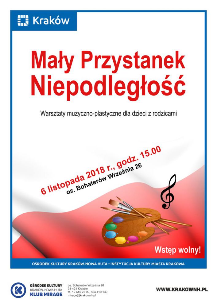 Klub Mirage Orodka Kultury Kraków-Nowa Huta (os. Bohaterów Wrzenia 26) zaprasza dzieci 6 listopada o godz. 15.00 na warsztaty plastyczne inspirowane zbliżajšcš się rocznicš Odzyskania Niepodległoci. W trakcie zajęć uczestnicy będš szykować kotyliony, przygotowanie prac umilajšc sobie naukš słów i piewaniem pieni patriotycznych.