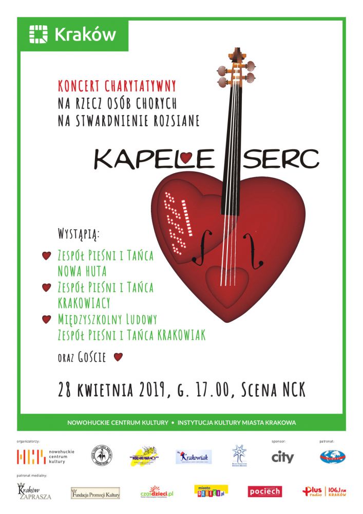 W tym roku mija 11 lat od momentu, kiedy po raz pierwszy w naszym kraju zagrały Kapele Serc. Pomysłodawcš tej ogólnopolskiej akcji charytatywnej jest Polska Sekcję CIOFF, która skutecznie promuje wydarzenie i z roku na rok zyskuje sobie coraz większe grono odbiorców. W 2010 roku akcja, dzięki staraniom Międzyszkolnego Ludowego Zespołu Pieœni i Tańca „Krakowiak”, pojawiła się w Krakowie. Do grona organizatorów krakowskich Kapeli Serc dołšczył Zespół Pieœni i Tańca „Nowa Huta”, a także Zespół Pieœni i Tańca „Krakowiacy”. Tegoroczny koncert odbędzie się 28.04.2019 r. Na scenie zobaczymy całš paletę różnorakich formacji artystycznych. Publicznoœć będzie mogła podziwiać zarówno m.in. taniec towarzyski, angielskie i szkockie tańce balowe, taniec hollywoodzki, jak i współczesny. Nie zabraknie oczywiœcie folkloru, który pojawi się w wykonaniu MLZPiT „Krakowiak”, ZPiT „Nowa Huta”i ZPiT „Krakowiacy”. W trakcie trwania koncertu zorganizowana zostanie zbiórka pieniędzy do puszek, jak również loteria fantowa z atrakcyjnymi przedmiotami do wylosowania (m.in. ksišżki, biżuteria, czy podarunek od Pana Prezydenta Jacka Majchrowskiego przekazany członkowi Powiatowej Społecznej Radzie ds. Osób Niepełnosprawnych, p. Małgorzacie Felger). Większoœć rzeczy, które znajdš się na loterii pochodzš od osób zaprzyjaŸnionych z ww. Towarzystwem i z organizatorami. Tradycjš jest to, iż krakowskie Kapele Serc dochód z loterii fantowej i zbiórki pieniędzy do puszek przekazujš Polskiemu Towarzystwu Stwardnienia Rozsianego (Oddział w Krakowie).
