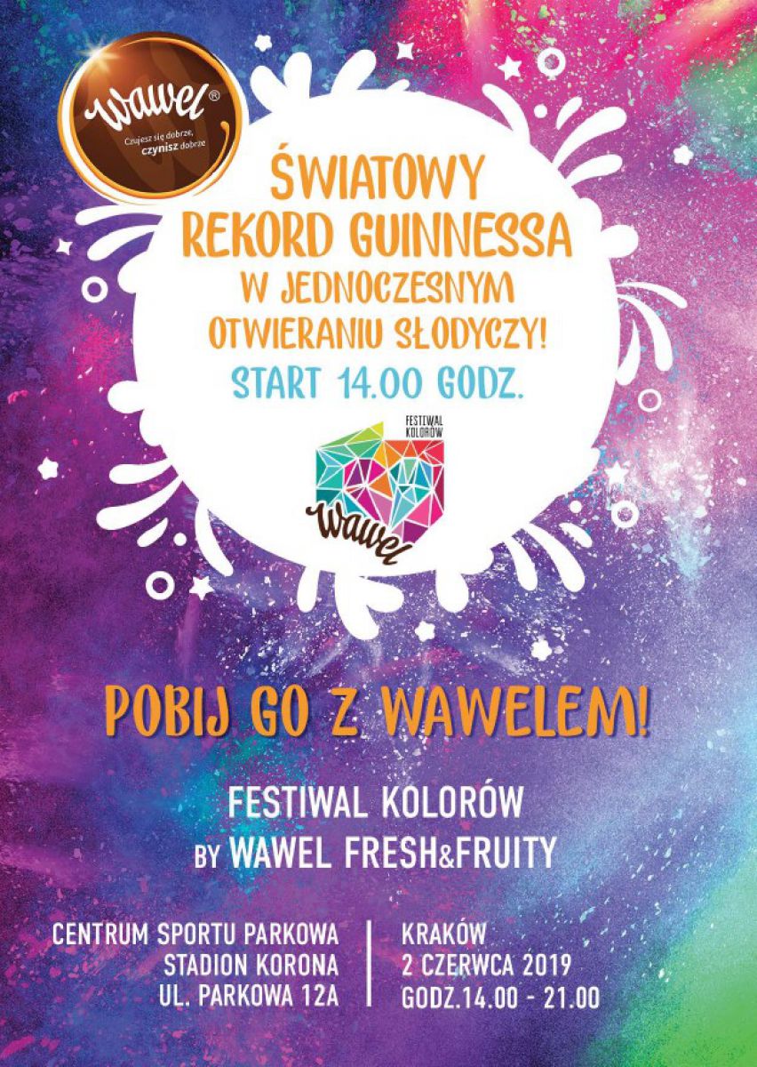 Już 2 czerwca w Krakowie, podczas Festiwalu Kolorów by Wawel Fresh & Fruity będzie miało miejsce wyjštkowo słodkie wydarzenie. Tego dnia marka Wawel wspólnie z uczestnikami Festiwalu podejmie słodkš próbę pobicia wiatowego Rekordu Guinnessa w