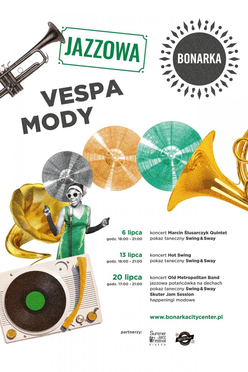 Jazzowa Vespa Mody wyjdzie poza mury Bonarki. W pierwsze trzy pištki lipca w najbardziej imprezowych i modnych miejscach Krakowa zjawiš się na skuterach muzycy z zespołu Hot Swing. Zagrajš spontaniczne mini-koncerty, podczas których będzie rozdawany magazyn o modzie i jazzie Hot & Style.