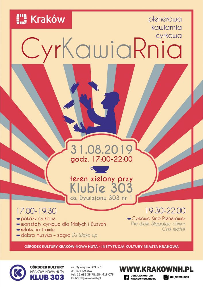 W sobotę 31 sierpnia w godzinach 18.00-22.00 Klub 303 Orodka Kultury Kraków-Nowa Huta (os. Dywizjonu 303 nr 1) już po raz pišty zaprasza do cyrkowej kawiarni plenerowej. W CyrKawiaRni gocie będš mogli usišć przy stolikach, na kocykach i poduszkach, zamówić nieodpłatnie bezalkoholowe tematyczne drinki np. Raj dla cyrkowca, Clown z głowš w chmurach, Skok Akrobaty i zdrowe przekšski. Ponadto będzie udostępniony grill, do przygotowania przez uczestników we własnym zakresie drobnych przekšsek. Strefa odpoczynku przy klimatycznej muzyce będzie wzbogacana pokazami cyrkowymi na mini scenie. Wystšpiš: w spektaklu cyrkowym Nibyluk. Słońce w kuli Cyrk-O-Maniacy z Klubu 303, w pokazie na Kole Reńskim Julia Bogusław - uczennica trzeciego roku Państwowej Szkoły Sztuki Cyrkowej w Julinku, w pokazie na drabinie cyrkowej - Tomasz Krawczyk, uczestnik a następnie instruktor zajęć cyrkowych w Klubie 303, obecnie uczeń pierwszego roku Państwowej Szkoły Sztuki Cyrkowej w Julinku. Od godziny 19.30 Gocie CyrKawiaRni będš mieli okazje zrelaksować się i obejrzeć filmy w plenerowym kinie. Wydarzeniu towarzyszyć będzie także promocja działań Klubu 303 na rok 2019/2020.