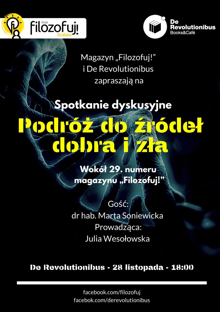 Problemy bioetyczne to coœ innego, niż rozważanie dylematu wagonika. Różniš się tym, że sš obecne w naszym życiu, a ich rozwišzania często dotykajš nas do żywego. Serdecznie zapraszamy na spotkanie “Podróż do Ÿródeł dobra i zła” wszystkich tych, którzy chcš usłyszeć m.in. o tym, czy problemy zwišzane z aborcjš i eutanazjš sš w ogóle rozstrzygalne. Poprowadzi je Julia Wesołowska, a jej goœciem będzie dr hab. Marta Soniewicka, specjalizujšca się w problematyce bioetycznej i filozofii prawa.