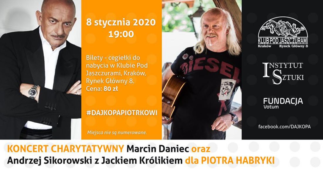Po raz kolejny dajemy kopa Piotrowi Habryce! Przyjaciele Piotra zapraszajš na koncert charytatywny, na którym wystšpiš Marcin Daniec oraz Andrzej Sikorowski w towarzystwie Jacka Królika. Spotkamy się w krakowskim Klubie pod Jaszczurami już 8 stycznia, o 19:00.