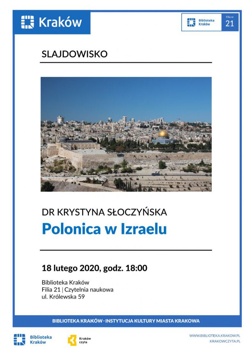 O polskim œladach na terenie państwa izraelskiego opowie rozmiłowana w tym kraju dr Krystyna Słoczyńska – emerytowany adiunkt AGH, z zamiłowania podróżniczka, wielokrotna organizatorka znanych w całej Polsce wypraw do Izraela. Prezentacji zdjęć z wypraw do Izraela będzie towarzyszył wykład podróżniczki.