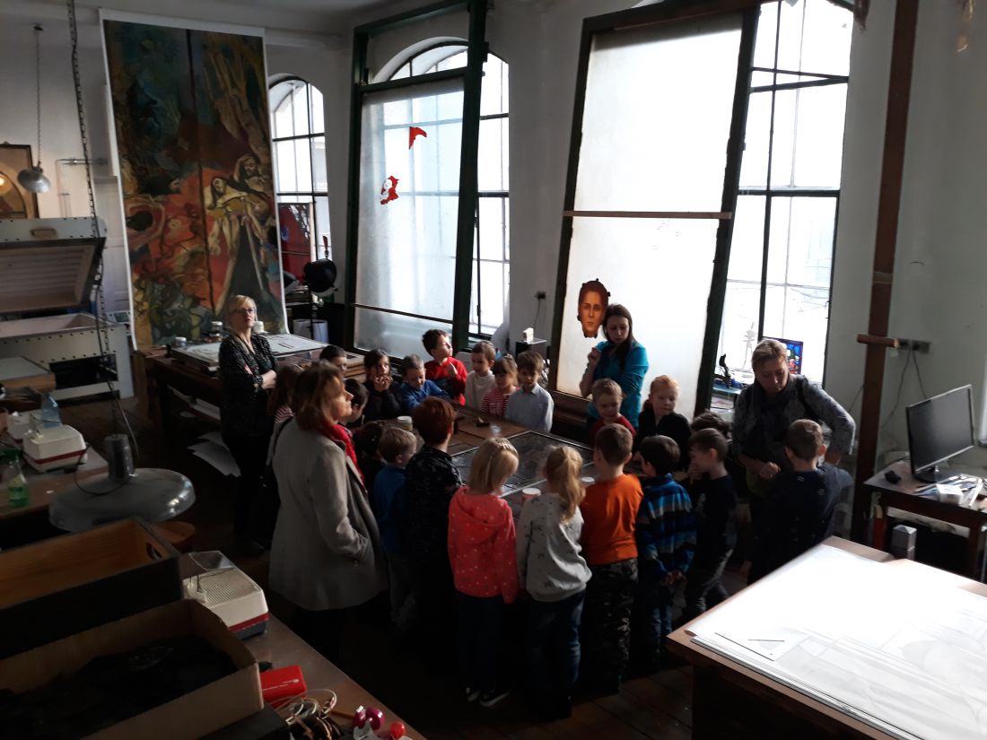 Dzieci zapo­znajš się z takimi poję­ciami jak żywe muzeum, warsz­tat, witraż. W trakcie zwiedzania obserwujš mistrzów witrażowych podczas pracy, mogš wzišć do ręki narzędzia i pędzle oraz pomalować na próbę element witrażu. Po zwiedzaniu zapraszamy dzieci na warsztaty.