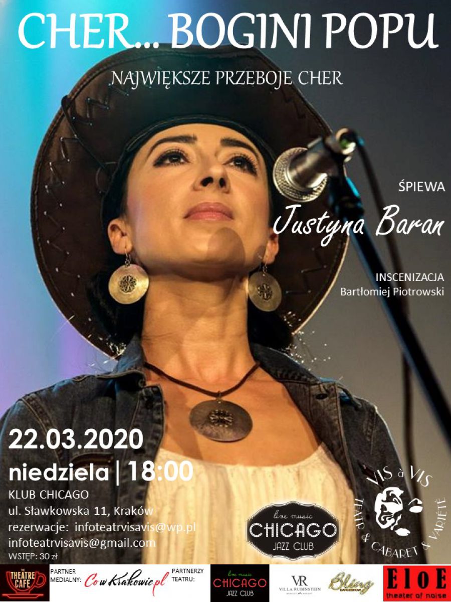 Podczas koncertu największe przeboje CHER – BOGINI POPU zaœpiewa dla Państwa artystka Teatru VIS A VIS – aktorka i wokalistka obdarzona niezwykłym głosem oraz ogromnym temperamentem scenicznym JUSTYNA BARAN.
