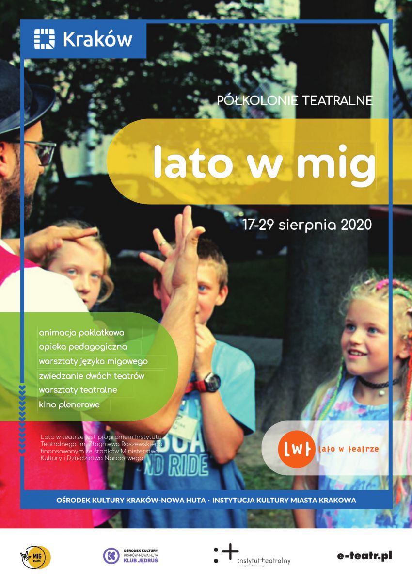 Klub Jędru Orodka Kultury Kraków-Nowa Huta zaprasza w drugiej połowie sierpnia na półkolonie teatralne Lato w MIG. Projekt jest oparty na autorskim programie, a oprócz szansy atrakcyjnego wypoczynku, pełni ważnš rolę łšczšcš społecznoci słyszšcych, Głuchych i CODA (dzieci niesłyszšcych rodziców), tworzšc przestrzeń współdziałania. Półkolonie odbywajš się w ramach programu Lato w teatrze, prowadzonego przez Instytut Teatralny im. Zbigniewa Raszewskiego. Udział w projekcie jest bezpłatny.