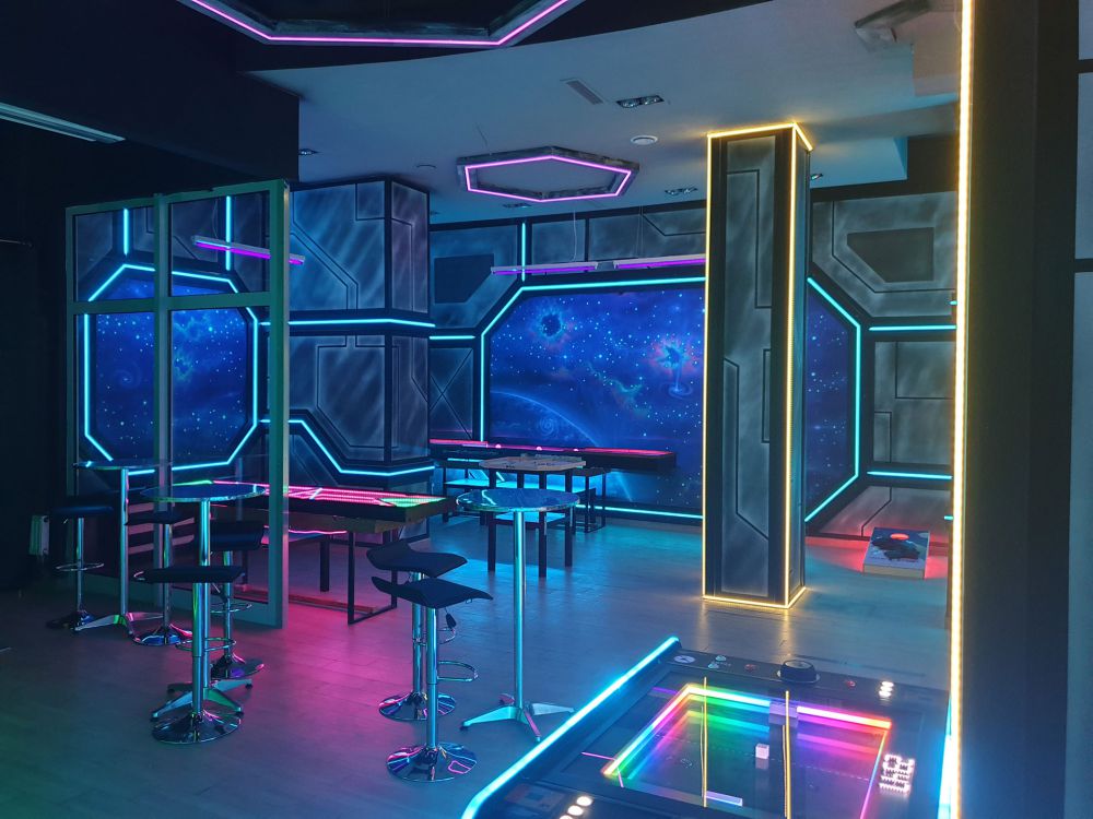 Cosmic Games Pub to miejsce nie z tej ziemi! Œwiadczy o tym już sam wystrój, który szybko przeniesie goœci w odległš galaktykę: gwiazdozbiory, planety, asteroidy - jest na co popatrzeć! Nowoczesne oœwietlenie LED dopełnia artystycznego dzieła, a wyglšd tego miejsca to dopiero poczštek atrakcji!
