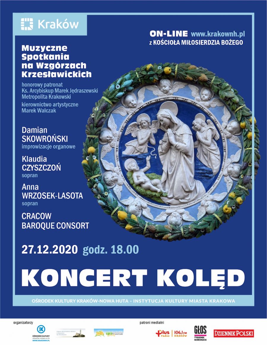Już od dawna cykl Muzyczne Spotkania na Wzgórzach Krzesławickich żegna się z każdym odchodzšcym rokiem Koncertem Kolęd. W jego trakcie piewane przez zaproszonych artystów pieni okresu Bożego Narodzenia znajdujš swoje dopełnienie w majestatycznych dwiękach organów, przy których zasiadajš zaproszeni przez organizatorów wirtuozi tego instrumentu. Nie inaczej będzie w obecnym, tak nietypowym dla wszystkich roku. Koncert z koniecznoci dostępny będzie dla miłoników kolęd i muzyki organowej w formie transmisji wideo w Internecie. Premiera wydarzenia odbędzie się w ostatniš niedzielę roku, 27 grudnia, o godz. 18:00. Koncert będzie można oglšdać za porednictwem strony internetowej Orodka Kultury Kraków-Nowa Huta (www.krakownh.pl), na Facebooku i na kanale instytucji w serwisie Youtube.